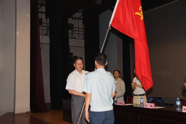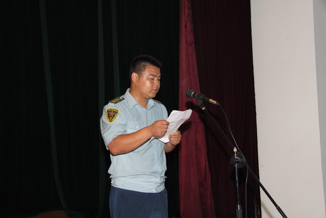 会上,刘建彪同志做了动员讲话,他从目前的国际形势讲到学生们今后的发展道路,言辞恳切,期望诚挚,最后他对军训团全体成员提出了几点要求,得到了大家阵阵的掌声呼应。接着教官代表和学员代表分别代表所有教官和所有参训学员表了决心。然后,各营宣读了挑、应战书,各营的挑、应战书将动员大会推向了高潮,三营的挑战书气势激昂,四营的应战书更是口号响亮,震彻整个礼堂。接着军训团副政委王铁练同志宣布了军训团纪律,大会的最后学院党委书记文锋同志代表学院向军训团授旗,鲜红的团旗在掌声中飘扬。最终大会在雄壮的中国人民解放军军歌中结束。