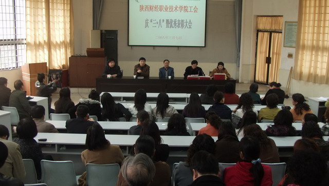 2008年3月7日下午陕财职院工会全体女会员、离退休女同志及2007年被评为“五好文明家族”、“好媳妇”、“三•八红旗手”的会员近200人欢聚一堂,参加了院工会举行的“庆三•八妇女节”暨“2007年优秀表彰大会”。学院党委文锋书记、刘文雅副书记莅临大会。