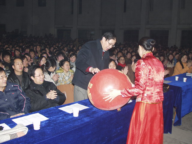 7:30时,晚会在热烈紧促的《吉祥锣鼓》声中开始,两名学生主持人出场致了开幕词。随后,礼仪小姐把内含祝福新年话语的红色大气球,送到学院领导手中让他们打开,主持人当场宣读内容,祝福学院在新在一年里蒸蒸日上,祝福全体师生万事如意。