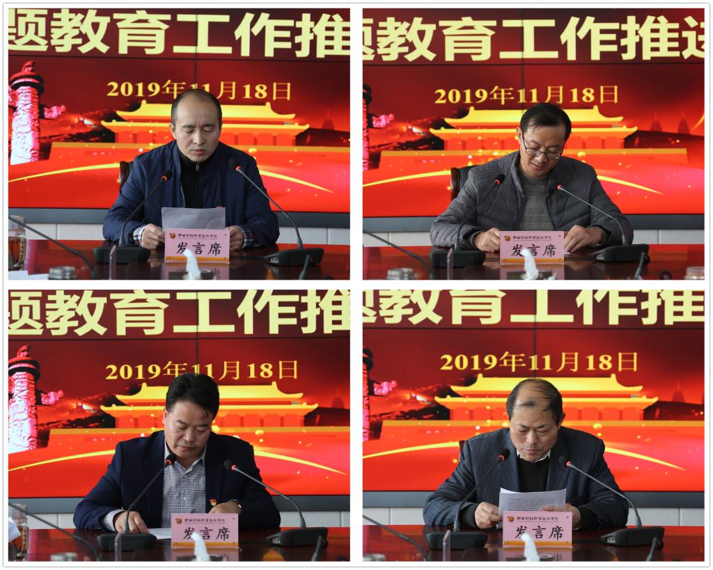 用友新道会计学院党总支书记乔晶策、管理学院党总支书记曾贵荣、商学院党总支书记张晓战、经济与金融学院党总支书记曹耀辉,分别汇报了主题教育的阶段性工作情况和下一步工作计划。