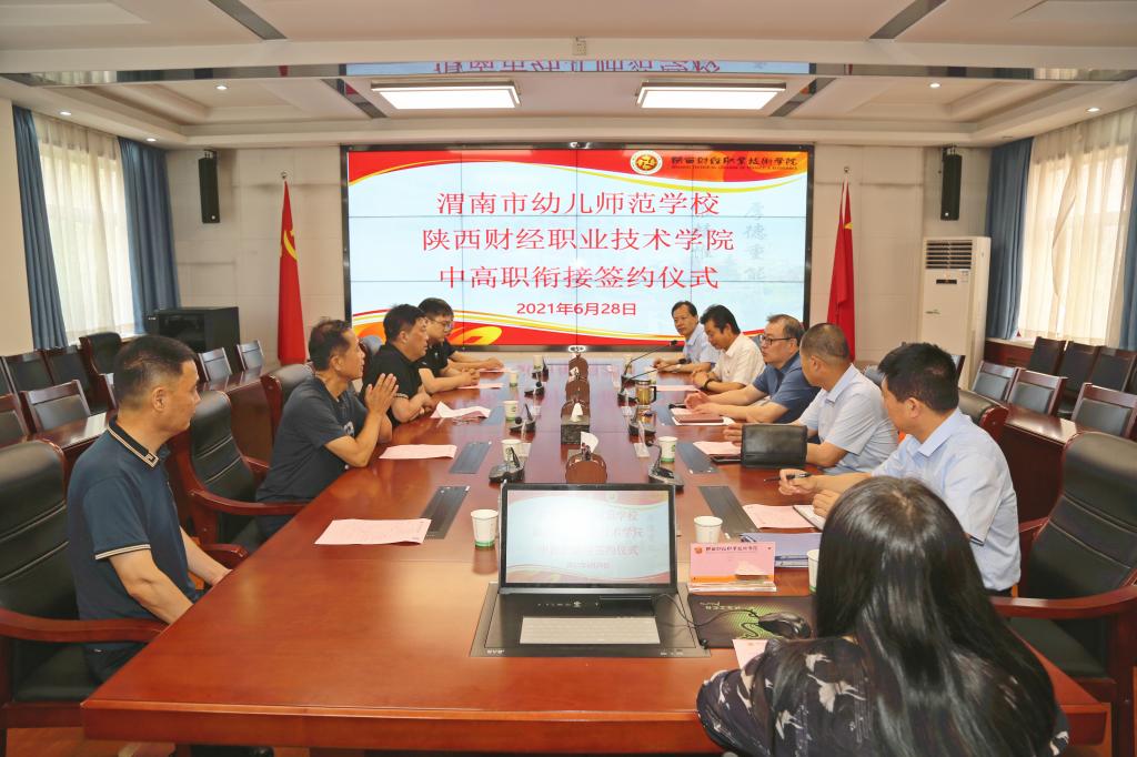 2021年6月28日上午,我院在办公楼四楼会议室与渭南市幼儿师范学校举行中高职衔接项目签约仪式。学院院长程书强出席,渭南市幼儿师范学校董事长赵东良、校长赵佳、学校特邀顾问,渭南市工艺协会会长刘长安、董事长助理赵永强、办公室主任杨保国,学院教务处处长邓迪夫、招生工作办公室副主任侯文亮、人文艺术学院院长贺兴文、执行院长崔斗参加了签约仪式。签约仪式由贺兴文主持。