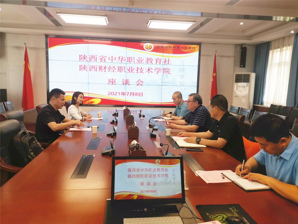 2021年7月8日,陕西省中华职业教育社温暖工程办公室副主任姜守新、陕西广和品牌设计有限公司总经理肖铃于来我校考察调研,洽谈学院加入陕西省中华职业教育社相关事宜。学院院长程书强,教务处处长邓迪夫、学生工作处处长乔晶策、招生办公室主任侯文亮、党政办公室副主任周辉辉参加此次座谈。