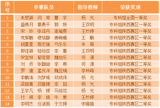 本次竞赛,陕西共有82所高等学校的3633支代表队一万多学生报名参加。经全国竞赛组委会评审,陕西高校共获得专科组全国一等奖4项,由我校杨光老师指导的朱思颖、闫奇、曹宇三位同学组成的代表队便是其中之一。这是我校第一次获得该赛项全国一等奖。