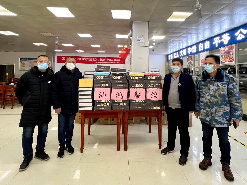 2021年12月31日,根据最新疫情防控要求,我校餐厅取消了堂食,师生就餐需全部打包带走食用。我校清馨餐厅承包公司西安汕鸿餐饮管理有限公司第一时间响应学校疫情防控要求,迅速向学校捐赠了235个精品五格打餐盒,方便在校教职工打餐。
