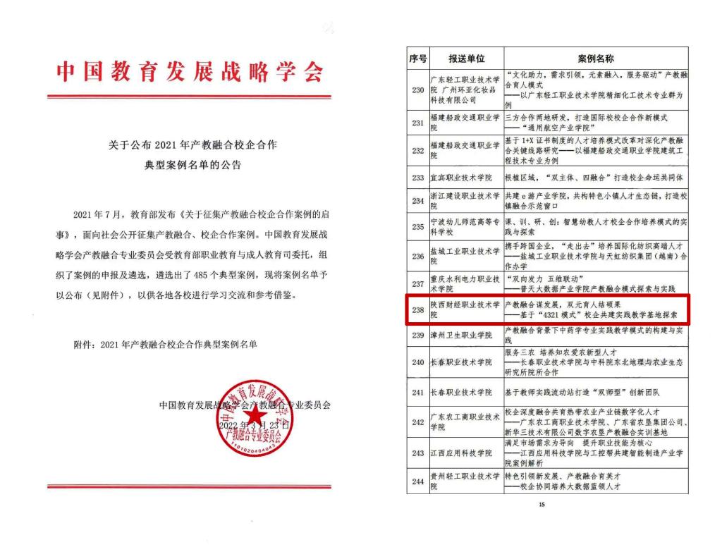 2021年7月,教育部发布《关于征集产教融合校企合作案例的启事》,面向社会公开征集产教融合、校企合作案例。中国教育发展战略学会产教融合专业委员会受教育部职业教育与成人教育司委托,组织了案例的申报及遴选,遴选出了485个典型案例,我校的《产教融合谋发展,双元育人结硕果——基于“4321模式”校企共建实践教学基地》案例入选教育部2021年产教融合校企合作典型案例。