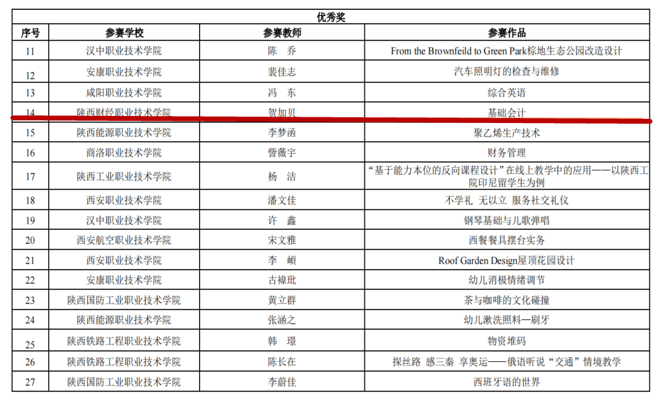 本次说课比赛共有包括我校在内全省14所高职院校,仅27名教师入围决赛。比赛通过线上线下相结合的方式进行,并诚邀西安交通大学、西安外国语大学等省内多所著名高校的英语、法语等5个语种10名专家教授担任评委,主要通过五个方面对参赛教师进行评分,包括教学理念、教学内容、教学创新、教学手段和教学效果。最终共评出一等奖2名、二等奖3名、三等奖5名、优秀奖17名。