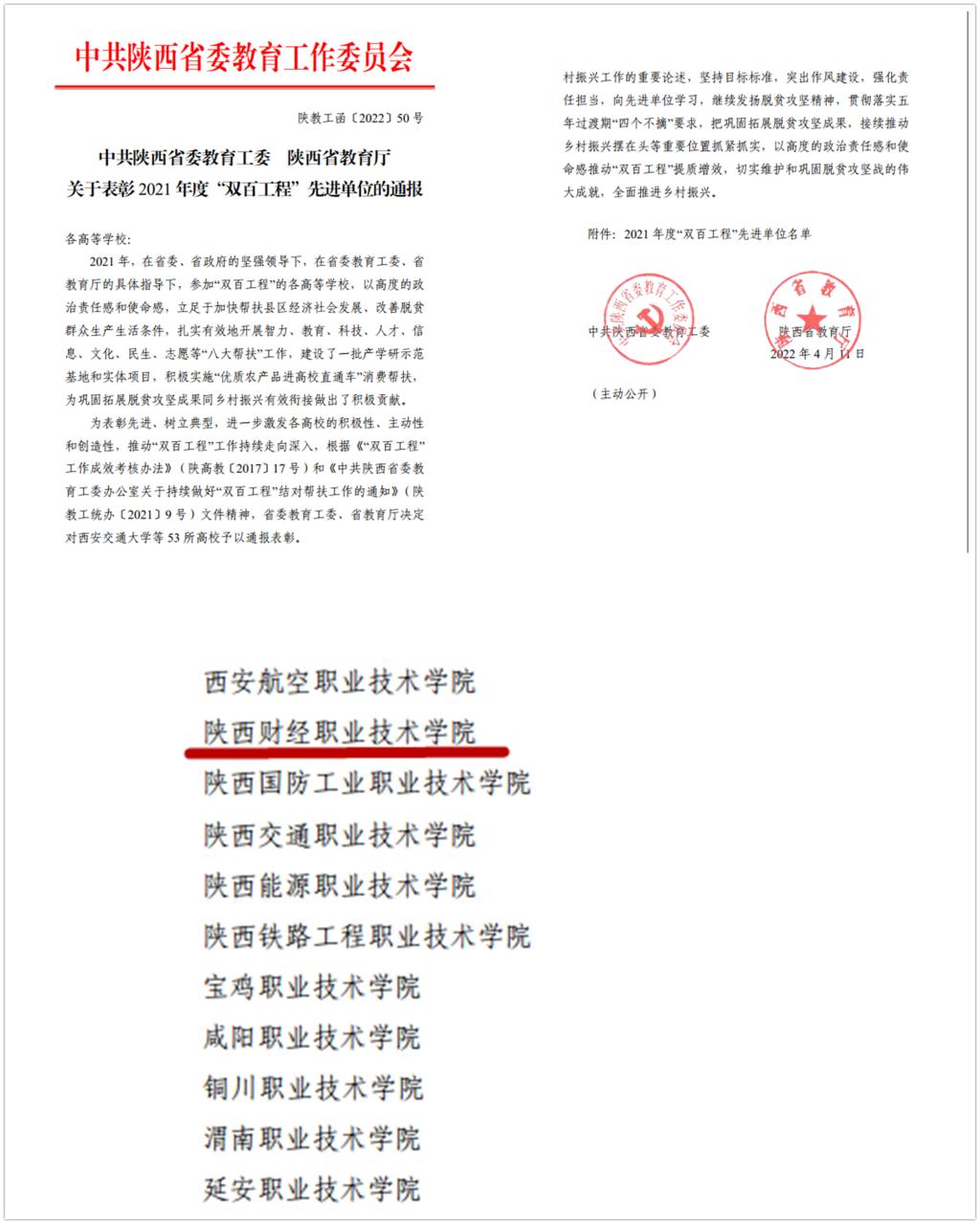 近日,中共陕西省委教育工委、陕西省教育厅发布《关于表彰2021年度“双百工程”先进单位的通报》(陕教工函[2022]50号),全省共有53所高校获得“双百工程”先进单位,我校名列其中,这是我校连续5年获此殊荣。