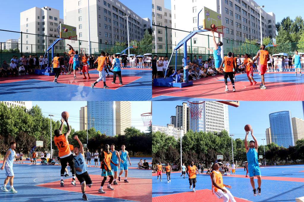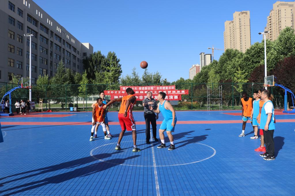 2022年6月13日下午,中非篮球友谊表演赛在灯光篮球场圆满落幕。本次友谊赛由国际交流与合作处主办,校工会和运动与健康管理学院协办。来自加蓬、津巴布韦、尼日利亚、刚果、乌干达等国家的7名球员组成的泰坦篮球队与我校师生组成的篮球队进行了激烈角逐。学校党委书记张志华、院长程书强、党委副书记朱华斌、副院长雷旭、工会主席王爱军出席了开幕式。