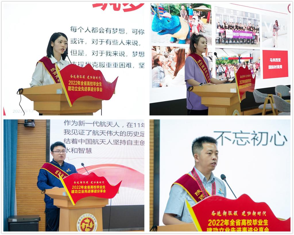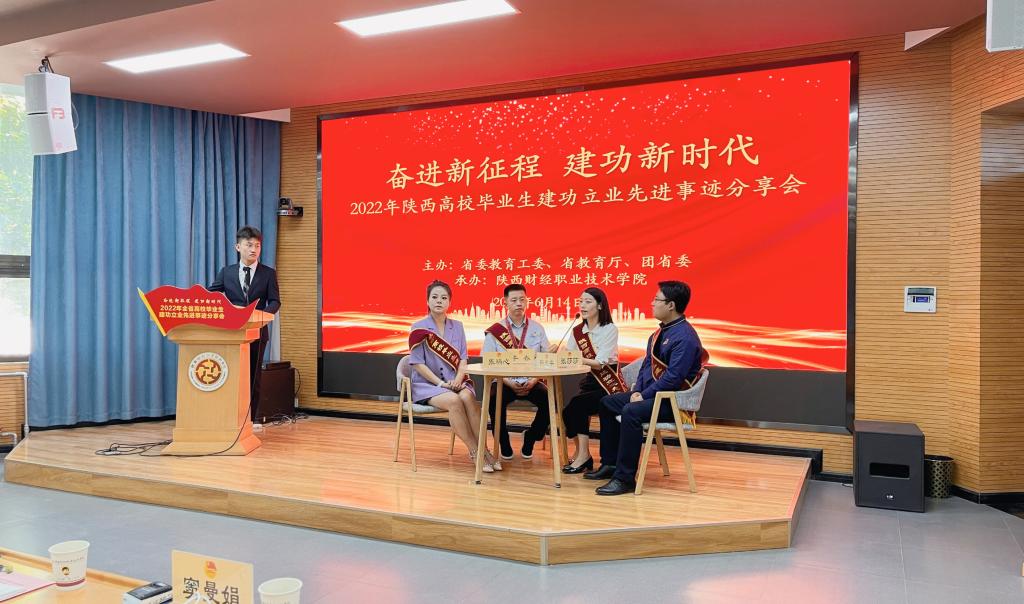 2022年6月14日下午,由省委教育工委、省教育厅、团省委共同主办,我校承办的“奋进新征程 建功新时代”2022年陕西高校毕业生建功立业先进事迹分享会在继续教育培训厅举办。陕西师范大学2012届毕业生、陕西省安康中学教师张莎莎,咸阳师范学院2017届毕业生、陕西瑞心文化艺术发展有限公司总经理张瑞心,陕西工业职业技术学院2008届毕业生、中国航天第六研究院西安航天发动机有限公司国家技师靳虎平,陕西工业职业技术学院2004届毕业生、中国航发首席技能专家李春分享他们建功立业的先进事迹。