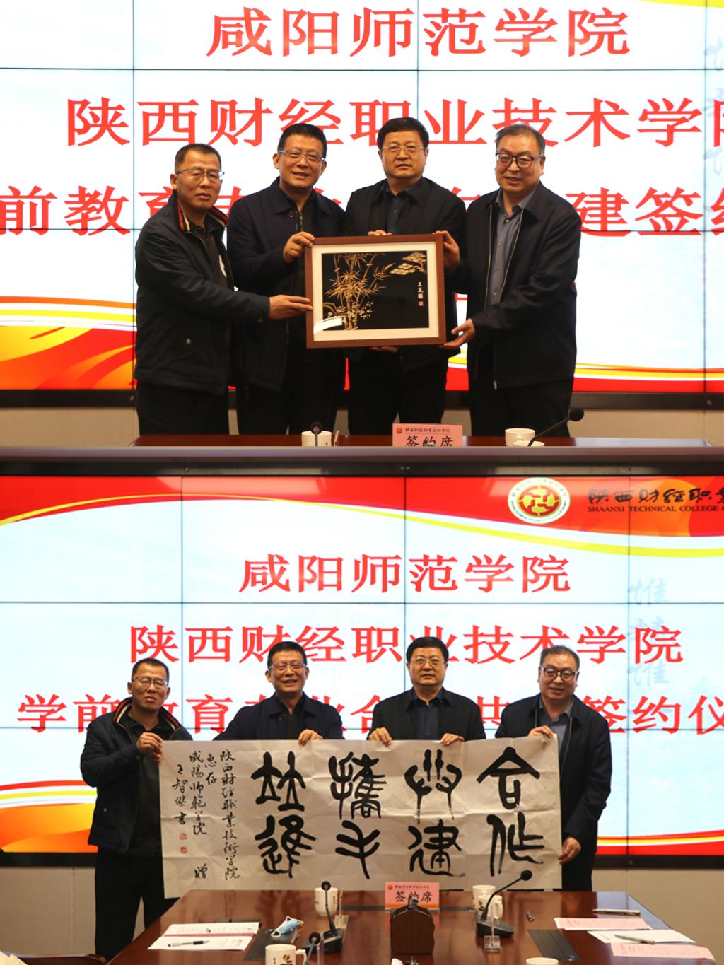 随后,程书强与张弘签订了“咸阳师范学院和陕西财经职业技术学院学前教育专业合作共建协议”,赵万东和张志华互赠了两校师生制作的文创作品。