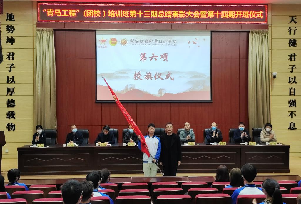 穆天楠为第十四期“青马工程”培训班(团校)授旗,校学生会主席团成员杨承康上台接旗,“筑梦青马,不负韶华”的口号响彻会场。