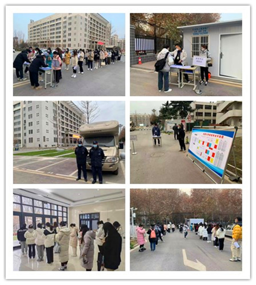 考试当天,采取“校内”和“校外”无接触分区考试,“校外”学生从学校西门出入,工作人员查验24小时核酸阴性证明、健康码绿码、行程码绿码(且未到过高风险区域),核对无误后前往签到处,填写入校时间,从指定区域前往考区,该区域由保卫处6名安保人员负责巡逻,提醒考生在指定区域活动,进入考场前核对考生身份证、准考证。7名工作人员分布在考场各个安全出口和楼梯出入口联防值守,避免校内、校外考生进行接触感染。