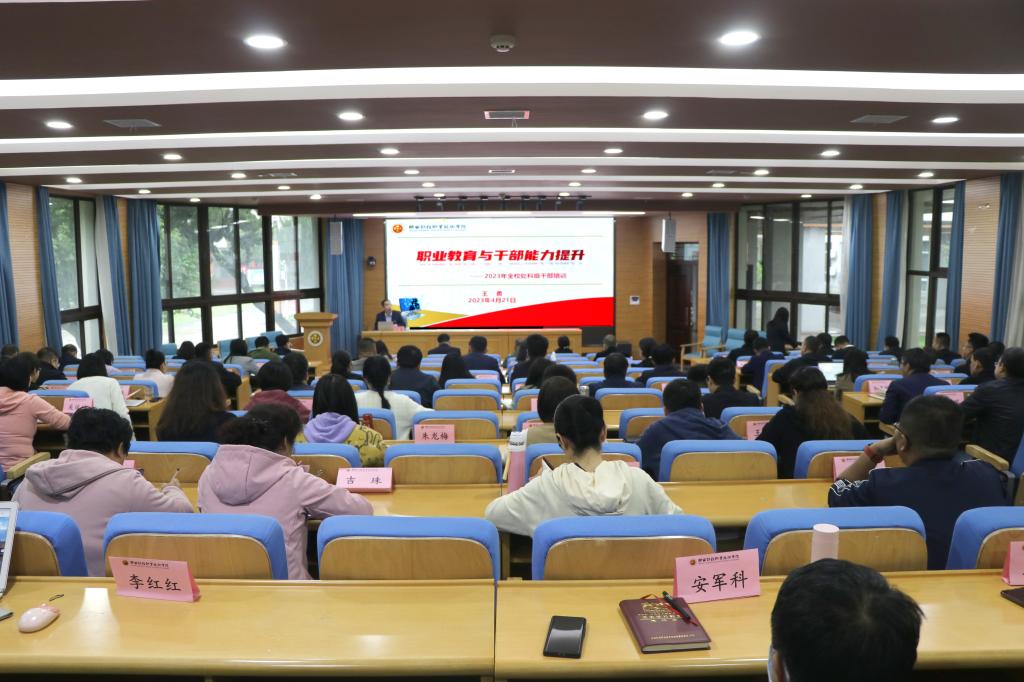 4月21日下午,学校副院长王勇以《职业教育与干部能力提升》为题,在继续教育培训厅为处科级干部和基层党组织书记作专题培训报告,全体处科级干部和各基层党组织书记110余人聆听报告。