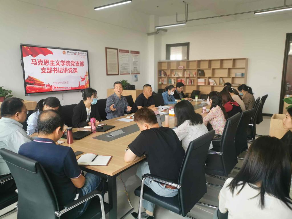 近日,党委副书记朱华斌在教学楼308“大思政课”创新发展中心就作了形势政策专题党课。马克思主义学院副院长殷蓬勃及全体无课党员教师专心聆听,认真学习并积极思考。