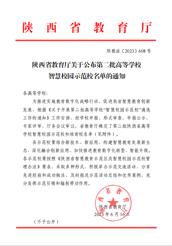 喜讯!6月16日,陕西省教育厅公布《关于第二批高等学校智慧校园示范校名单的通知》(陕教函〔2023〕608号),我校被认定为“陕西省高等学校智慧校园示范校”,荣获全省教育信息化领域最高殊荣。