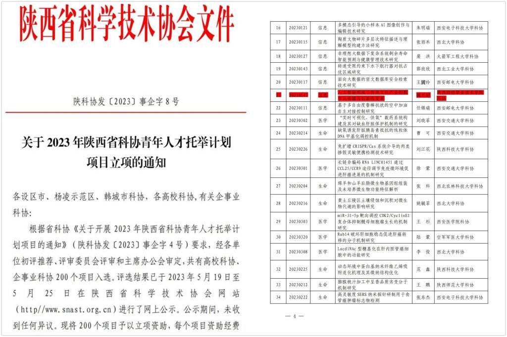 陕西青年人才托举计划项目的目的是充分发挥高校科协院士专家聚焦的专业优势,强化对青年人才苗子的发现举荐作用,及早发现、重点扶持、加快培养有较大潜力的年轻科技工作者,为他们发展提供一定的支持和必要的科研条件,指导年轻人才过好“科研黄金期”,夯实职业基础,扶持年轻人才逐步成长为德才兼备、勇于创新的优秀科技人才。本次评选经过前期个人申报,学校推荐,省科协组织专家评审,我校成功入选一个项目。