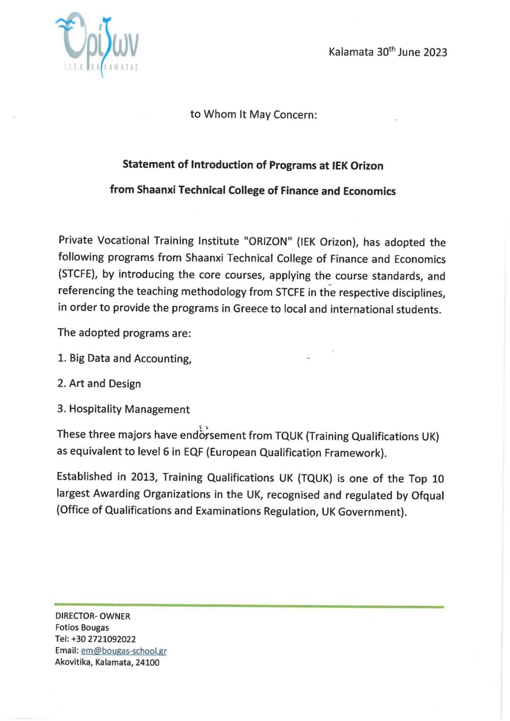 希腊奥利森职业培训学校采纳我校三套专业认证声明