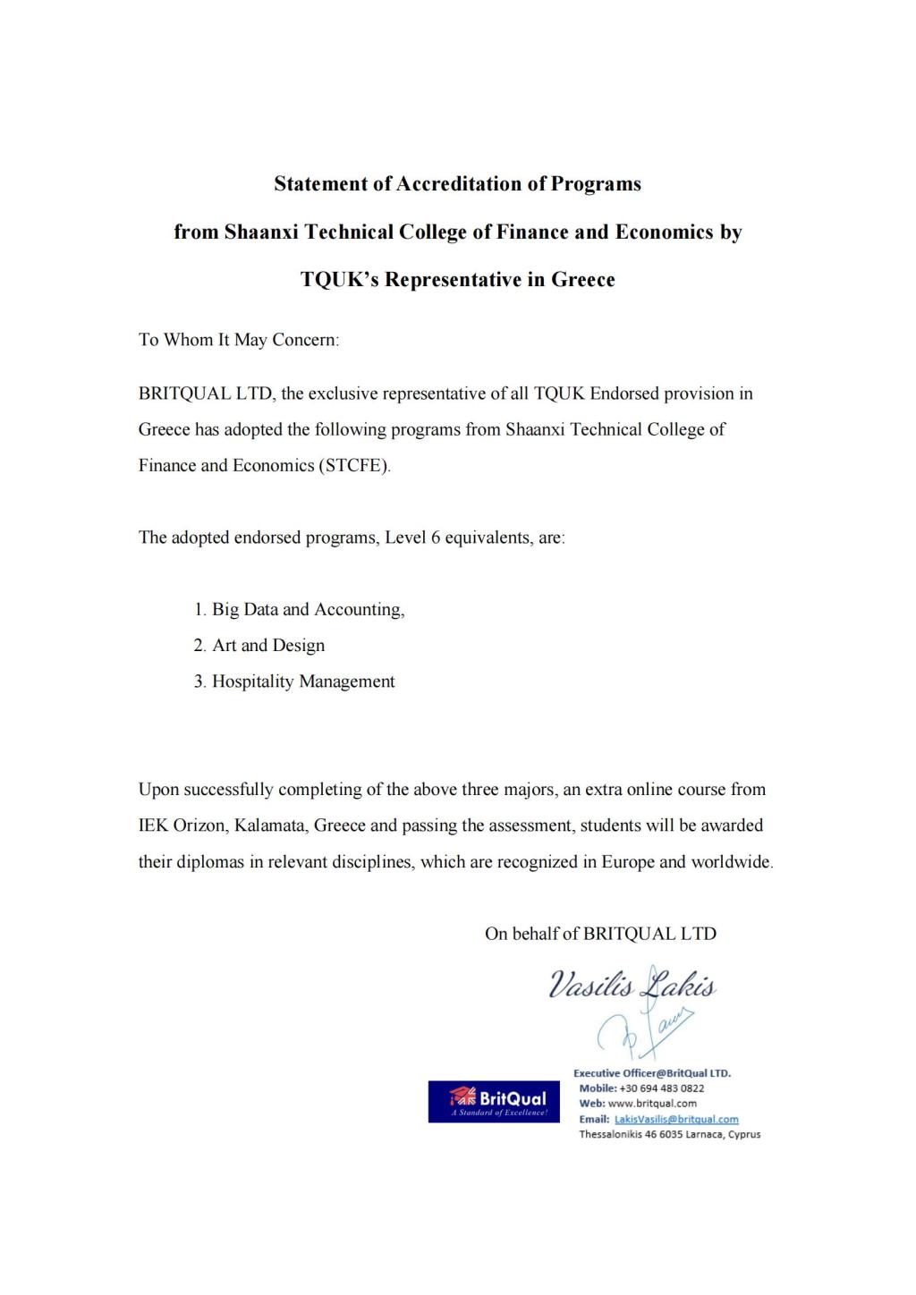近日,从中希秦岭工坊获悉,我校大数据与会计、工艺美术品设计及酒店管理三套专业标准获希腊权威评估机构TQUK认证,认证等级为六级,该级别是欧洲职业培训认证标准的最高级。