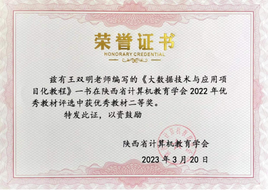 《大数据技术与应用项目化教程》由王双明主编,张沛强、张军强任副主编,殷建军、梁丽、闫娜、李聪颖、赵恩毅、袁小玲和张拓参编。本教材为2022年陕西省哲学社会科学重大理论与现实问题研究项目“省级‘双高’背景下大数据通识课程新型活页式教材研究”研究成果。教材于2022年8月由西北大学出版社出版,连续3次印刷,印数已达15000余册。