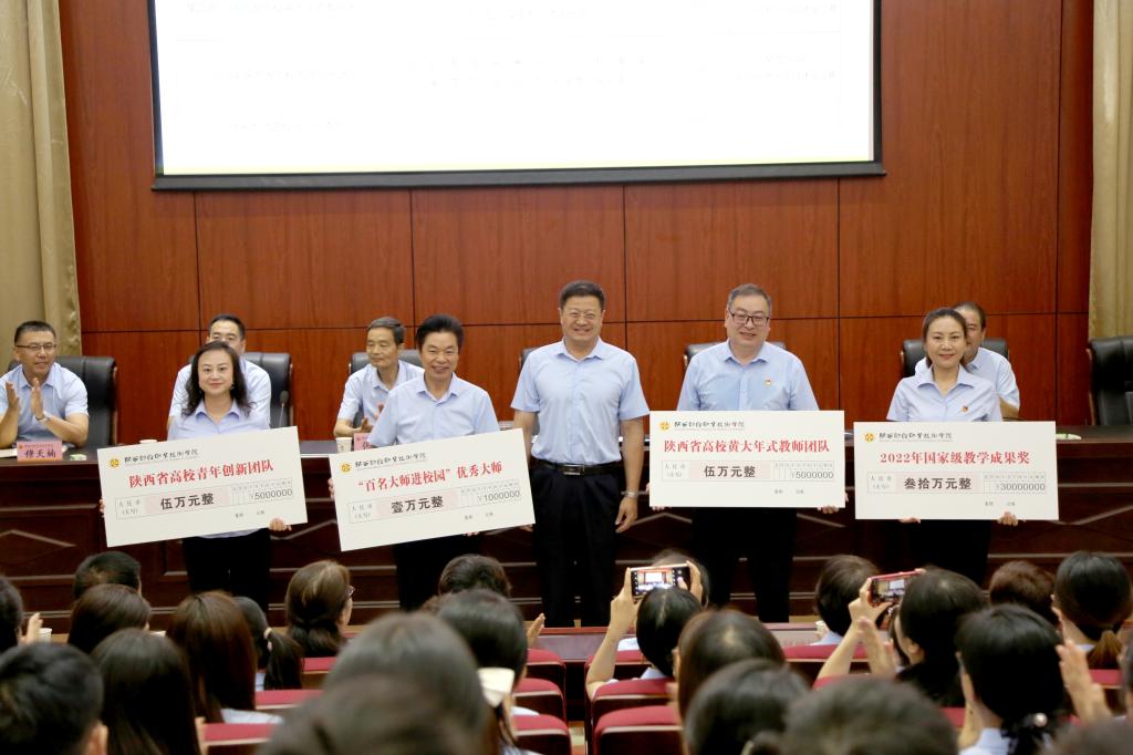 受表彰的“2022年国家级教学成果奖”团队代表、“陕西省高校黄大年式教师团队”代表、“2023年陕西省高校青年创新团队”代表、“百名大师进校园”优秀大师