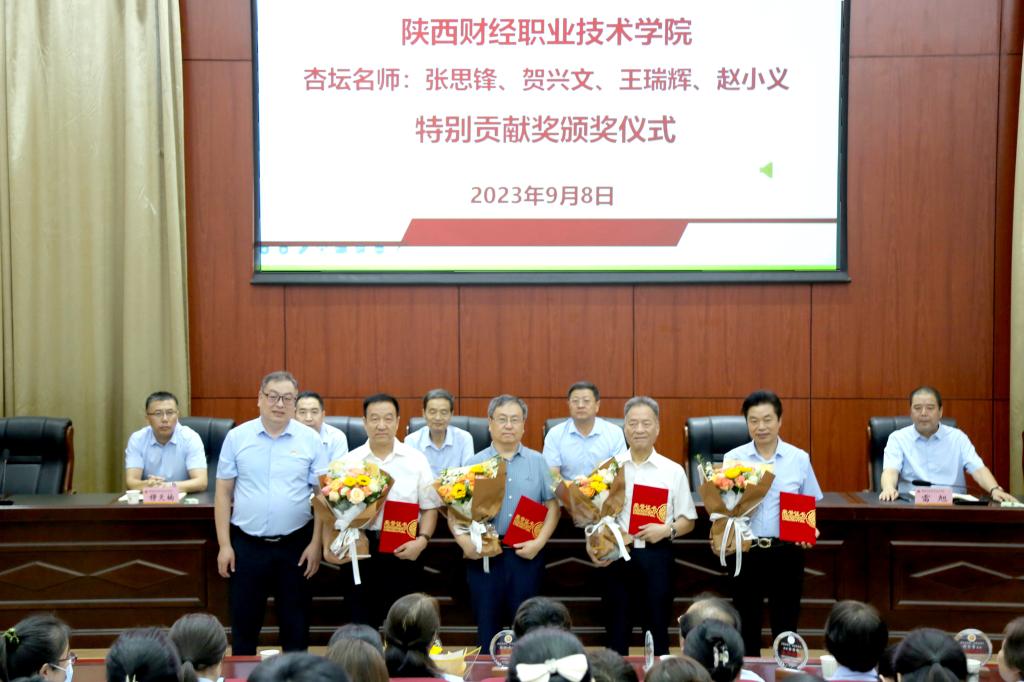 大会对近年来我校聘请的学术造诣高、技艺精湛、社会声誉优良的专家不遗余力的帮助和指导表示感谢,院长程书强向专家代表张思锋、贺兴文、王瑞辉、赵小义颁发了陕西财经职业技术学院杏坛名师“特别贡献奖”并合影留念。