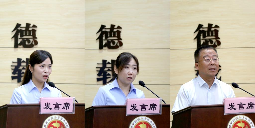 教师代表丁静在发言中用年少无畏的逐梦之心、踏实担当的仁爱之心、虚怀若谷的进取之心、安之若素的感恩之心等四颗“心”谈了一线教师对教育情怀的理解。她谈到近年来全校上下凝心聚力援梯而上,招生规模屡创新高,二级学院不断扩大,技能竞赛屡创佳绩,标志成果不断刷新,社会影响持续提升,在各方面齐头并进之时,又迎来了提振信心的新校区。学校不遗余力地为教师提供支持和帮助,给了教师一个又一个展现风采的舞台,作为一名青年教师,定当全力以赴、击楫中流、不负众望。第九届“互联网+”陕西省省赛金奖项目指导教师代表赵莹发言,讲述了大赛受到学校党委高度重视,张志华书记、程书强院长等校领导深入一线走访慰问备赛师生,通过整合各类资源渠道,建立专家指导库,聘请多名国赛评委、行业专家对推荐省赛项目进行了多维度培训和一对一精细化的多轮打磨。最终选送的18个项目参加省赛均获佳绩,获得8项金奖的数量位居全省高职院校第一,成绩达历年最好,实现了获奖数量和质量的双突破。她呼吁更多的老师和学生们能够积极参与比赛,在创新创业中增长才干、在积极备赛中锤炼意志,在激烈比赛中提升自我。退休教师代表卞文博教授在发言中,慷慨激昂的谈起自己39年的从教经验,重点谈了近4年学校的巨大变化,肯定了学校又快又好发展和取得的喜人成绩,在学校发展历史上是空前绝后、绝无仅有的。他真心感谢学校为退休教职工举办了首届荣休仪式,作为退休教师,只要学校需要,随时准备撸起袖子加油干!同时,卞文博激情澎湃的呼吁全体教职工继续发扬苦干精神,冲锋在前、团结协作、自动自发,与正能量为伍、与道同者一道、与良善者同行,坚守工匠精神,为学校发展贡献力量!