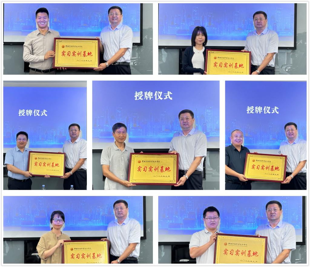 张志华代表学校向西咸人才集团、魔茧科技有限公司、陕西达诚智博教育科技有限公司、陕西学致励成教育科技集团有限公司、西安新睿合职业技能培训学校有限公司、陕西金隽企业管理有限公司、陕西护航人力咨询有限公司、西安宇华方大职业技能培训学校有限公司等8家企业授予了“实习实训基地”牌匾。