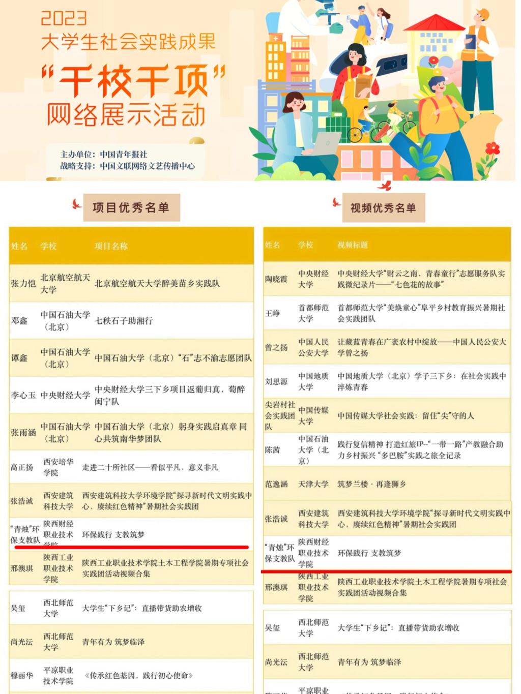 近日,由中国青年报社主办的2023大学生社会实践成果“千校千项”网络展示活动评选结果揭晓,我校“青烛”生态环保支教队从全国6000余个项目中脱颖而出,荣获2023全国大学生“千校千项”优秀社会实践项目,由“青烛”生态环保支教队报送的《环保践行、支教筑梦》视频荣获2023全国大学生“千校千项”优秀社会实践视频。
