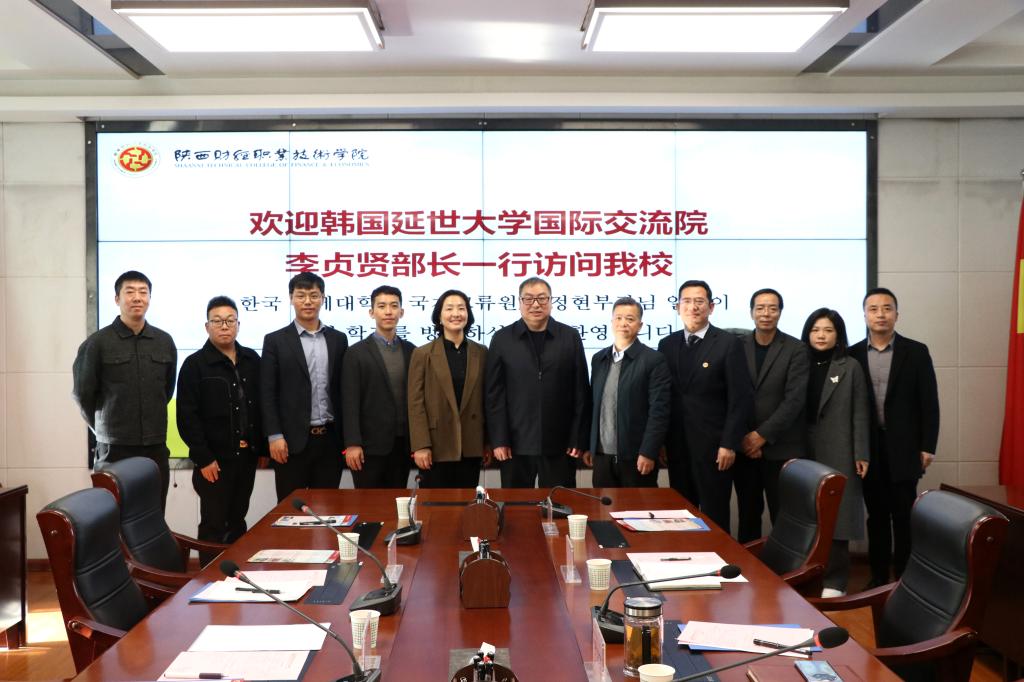 11月27日上午,韩国延世大学国际交流院李贞贤部长、国际交流院金渭杓主任一行6人来访我校。校长程书强在相关部门负责人的陪同下会见了李贞贤一行,并在办公楼四楼会议室召开座谈会。韩国延世大学国际交流院部长李贞贤、主任金渭杓及延世大学驻中国代表孙生、何树军、杨超、张婕妤;陕西财经职业技术学院院长程书强、副书记朱华斌、教务处处长刘军、全北学院党支部书记雷剑、全北学院副院长杨华、全北学院及国际交流与合作处全体人员参加了此次会议。会议由朱华斌副书记主持。
