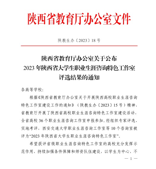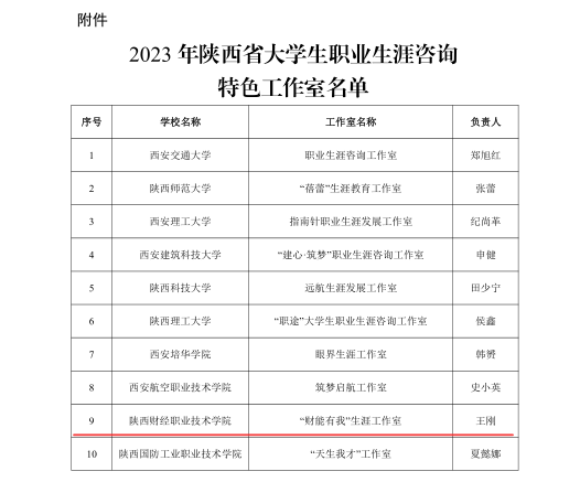 12月12日,陕西省教育厅公布了2023年陕西省大学生职业生涯咨询特色工作室评选结果。全省高校36 个职业生涯咨询工作室申报参加,经省教育厅组织专家评选、实地考评,我校“财能有我”生涯工作室等10 个咨询室被评为“2023 年陕西省大学生职业生涯咨询特色工作室”。