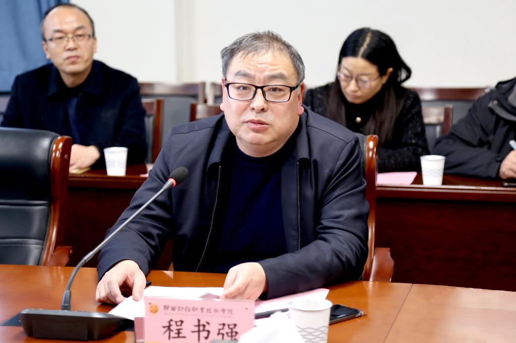 程书强代表学校作汇报,首先对检查组一行莅临表示热烈欢迎。并从办学历史、办学实力、人才培养、教学改革、服务社会等方面向各位专家介绍了学校基本情况。从生均图书、生均教学科研仪器设备、生师比、具有研究生学位教师占比、生均教学行政用房面积等方面汇报了学校办学条件达标完成情况。