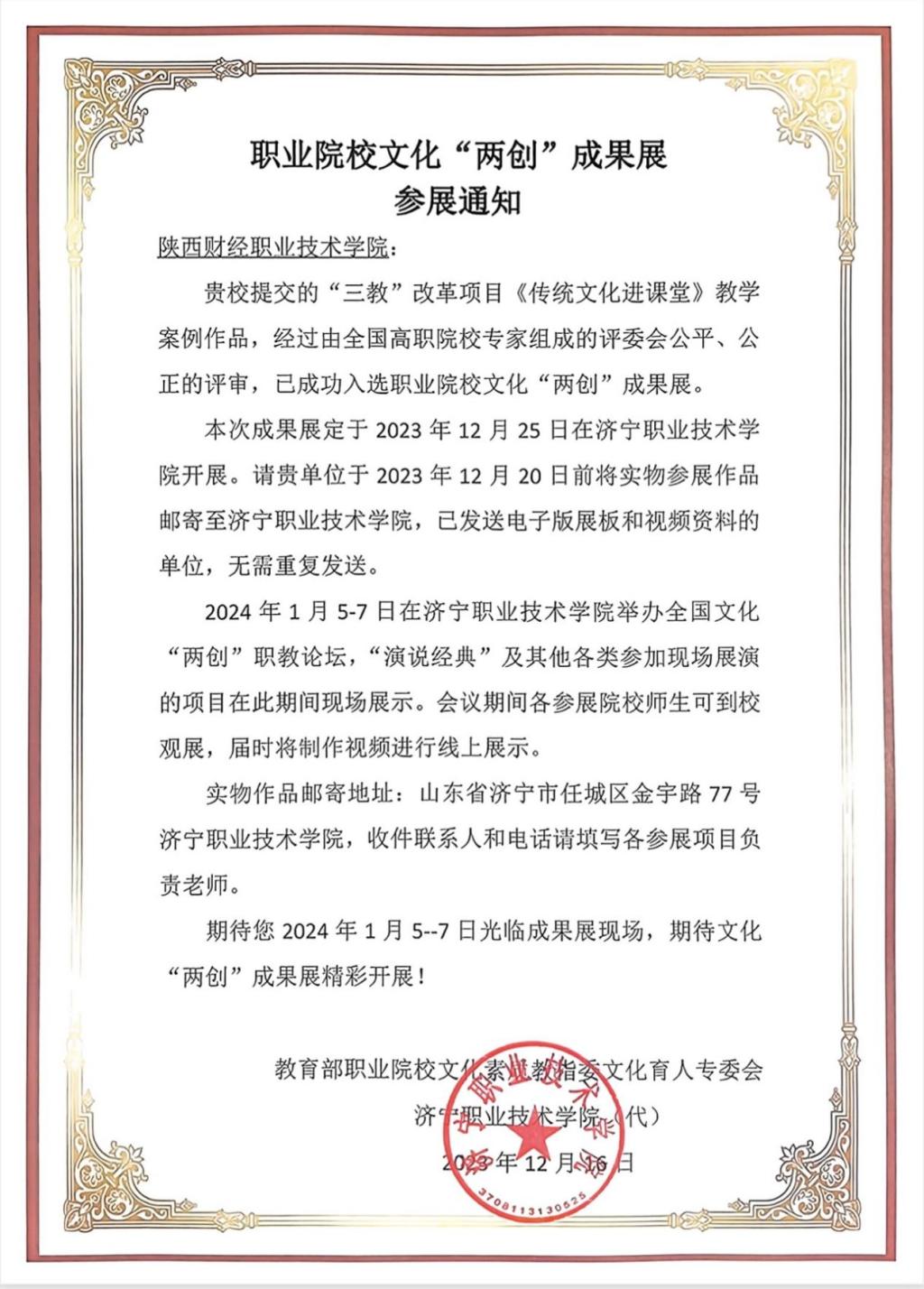 为了展示职业院校在文化“两创”工作方面形成的工作模式、特色经验及实践效果,2023年12月教育部职业院校文化素质教育指导委员会主办了面向全国职业院校的文化“两创”成果展示活动,本次活动内容包括“三教”改革、匠心非遗等九个方面,经过层层筛选与严格评审,我校选送的“匠心非遗麦秆画手工系列作品”“三教改革传统文化进课堂”2个项目成功入选职业院校文化“两创”成果展。