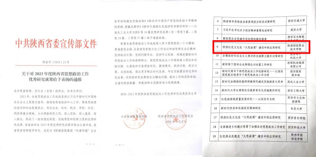 根据省委宣传部《关于对2023年度陕西省思想政治工作优秀研究成果给予表扬的通报》(陕宣字〔2024]23号),我校操龙升主持的重点研究课题《陕西红色文化在“大思政课”建设中的应用研究》研究成果,荣获2023年度陕西省思想政治工作优秀研究成果三等奖。