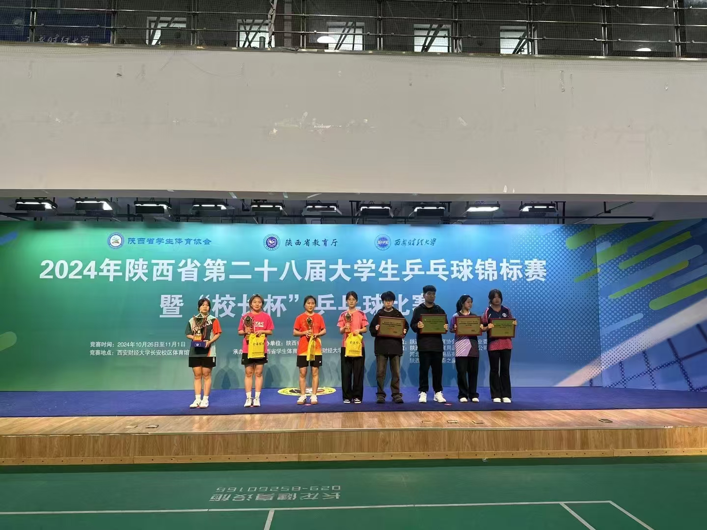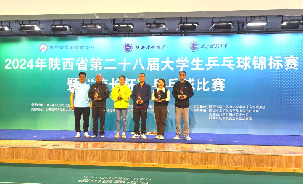 2024年10月28日11至1日,由陕西省教育厅主办,陕西省学生体育协会、西安财经大学承办的陕西省第二十八届大学生乒乓球锦标赛暨“校长杯”乒乓球赛在西安财经大学落下帷幕。来自全省21所高校的908名运动员同场竞技,是陕西省历年来参赛人数最多、覆盖最广的校园乒乓球赛事。我校党委副书记朱华斌,党委副书记、纪委书记殷兴光、副校长张秦龙组队参加“校长杯”乒乓球赛;由魏声老师带队的13名同学参与学生竞赛。他们本着拼搏进取、坚持到底、永不放弃的体育精神,团结协作、奋力拼搏,经过激烈角逐,取得了优秀成绩。