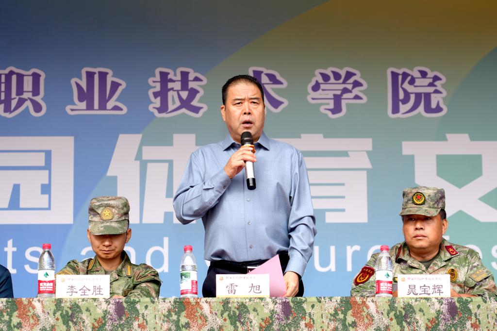 雷旭为军训团授旗,旗帜猎猎作响,既承载着学校的殷切期望,更象征着责任与使命的传承。雷旭宣布开训动员令,全场师生热血沸腾,"坚持到底,绝不放弃"的口号声浪奔涌,激荡出青春最激昂的旋律。