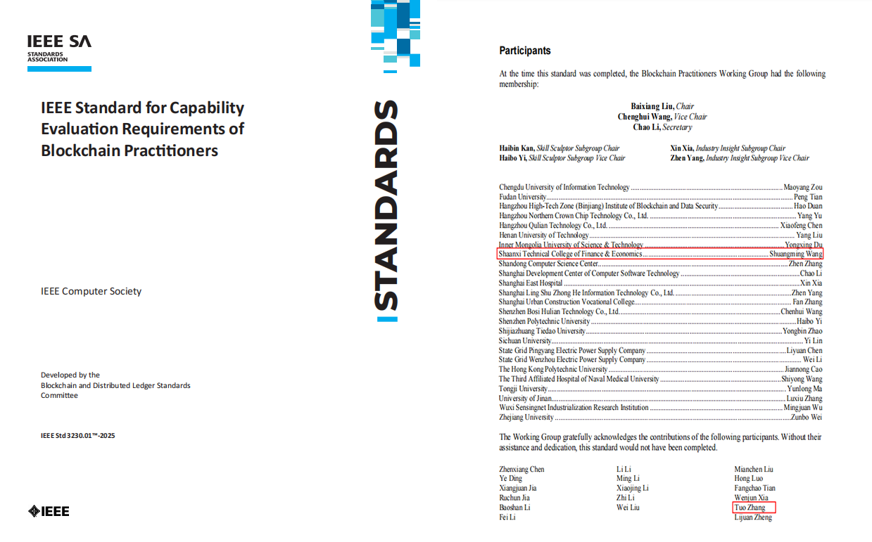 近日,由复旦大学牵头,四川大学、浙江大学、同济大学以及香港理工大学等25家高校与企业共同制定的“IEEE区块链从业者能力评估标准”通过审核验收正式向全球发布。我校大数据与人工智能学院王双明教授、区块链技术应用专业负责人张拓受邀深度参与该标准制定相关工作。